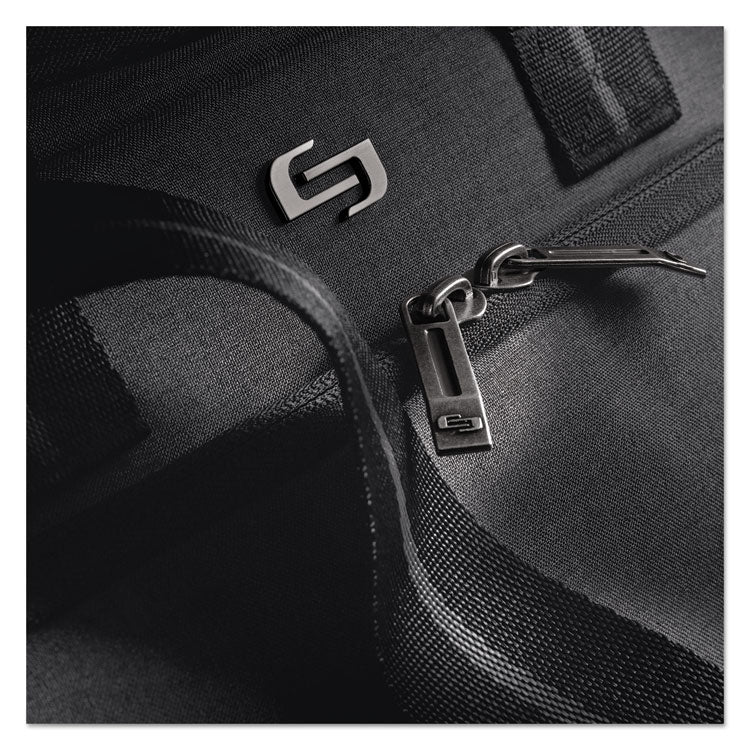 Fully padded 15.6" laptop compartment. Interior iPad®/tablet pocket. Full size front zip-down organizer section. Padded carry handles with magnetic snaps. Adjustable shoulder strap. Back strap slides over luggage handle.