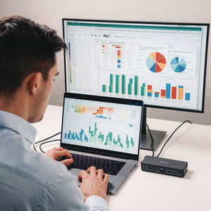- Single-Cable Connection simplifies the workspace with one cable to connect multiple devices.
