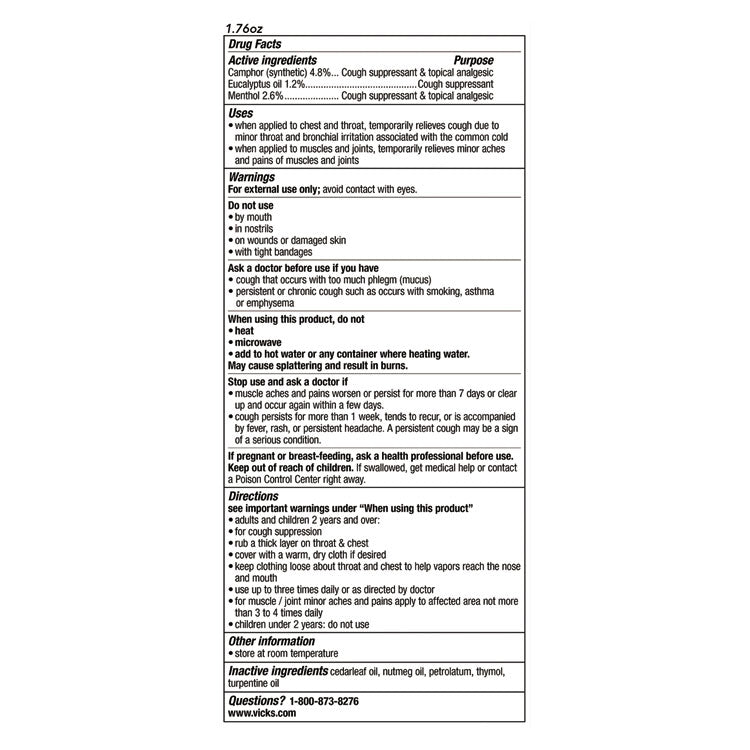 Kiss your cough goodbye, with a topical cough medicine with medicated vapors. It starts working quickly for to relieve cough symptoms. Appropriate for ages two and up, topical VapoRub® is a comforting choice for sick children. Not likely to cause drowsiness or jittery side effects when used as directed. Because it is a topical cough medicine, it may be appropriate for diabetics looking for an alternative to oral cough medicines that contain sugar. For more information, ask your doctor.