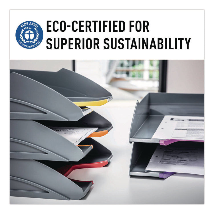 The VARICOLOR® Stackable Letter Tray Set from DURABLE® is a versatile storage solution that streamlines your organization and productivity. The five color-coded trays keep all your essential documents neatly organized, whether it's paperwork, files, mail, brochures, notepads, important documents and more. Maintaining a clutter-free workspace is effortless – simply place it directly on your desktop to ensure essential paperwork is always within reach. For those seeking even greater space optimization, stack multiple units together – they can be stacked either vertically or staggered. Alternatively, seamlessly integrate them into standard office storage cabinets, sideboards, and bookcases for a streamlined and organized workspace. Crafted with premium, long-lasting plastic, VARICOLOR is designed to stand the test of time, making it the perfect solution for high-traffic environments where document handling is frequent. This VARICOLOR Stackable Letter Tray Set is Blue Angel certified, a globally recognized standard. Awarded by the German government, Blue Angel certification ensures that this item meets rigorous criteria for sustainability, health, and performance. By choosing this product, you're supporting responsible manufacturing practices Each tray has a colorful cut out so you can easily locate and grasp your files. The anti-slip base pads provide stability and protection, preventing slips and desktop scratches. VARICOLOR is the perfect solution for a wide range of environments, ideal for organizing documents in offices, schools, restaurants, hotel front desks, retail stores, banks, hospitals, maintenance offices, legal offices, senior living homes, warehouses, manufacturing, industrial settings, and even at home. For over 100 years, DURABLE has been synonymous with quality, design, and functionality. As an international workplace expert with German roots, we create reliable products built to last. Our commitment to sustainability is embodied by our RETHINK mindset, integrating the four R's (Refuse, Reduce, Reuse, Recycle) into every aspect of our process. Continuing this legacy, DURABLE aims to lead with purpose and responsibility, crafting solutions with lasting value.