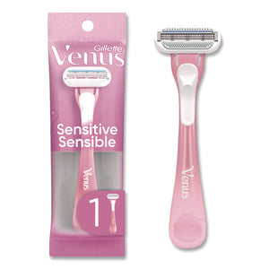 The Gillette Venus Sensitive female razor blade is designed with a woman's body in mind. The razor is made for women with sensitive skin. This razor features three curve-hugging blades for a shave with up to 0% irritation, and cuts hair closer to the skin for a shave that keeps your skin protected. Designed with a soft-grip gel handle and three blades for a close and comfortable shave.