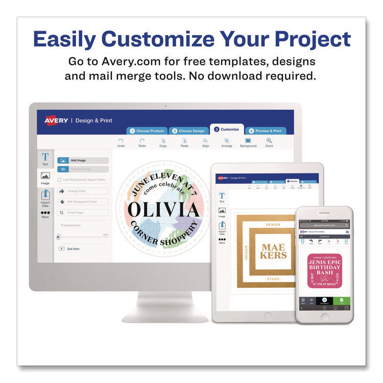 Labels can be printed with vivid color and sharp text and are ideal for special mailings, messages, invitations and announcements. Easy to customize with free templates and designs using Avery Design & Print. 8.5" x 11" sheets for color laser and inkjet printers.