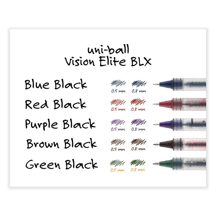 Give your writing a boldly infused flavor with Vision Elite BLX Rollerball Pens from uni-ball featuring a bend-resistant stainless steel tip and tungsten carbide rollerball. Capped roller pens deliver smooth, intense lines with unparalleled definition—useful for note taking, list making, signing checks and legal documents, and even uniquely embellishing creative writing projects. Innovative uni Super Ink technology effectively entraps the gel ink into the paper, producing fraud, fade and water-resistant documents that resist check washing or bleaching. These Vision Elite pens have a special design that withstands cabin pressure variances without leaking, making them useful for travelers. Exclusive Uni-Flow Ink System ensures a consistent, delightfully fluid writing experience, and a translucent window ensures that you don't run out of ink unexpectedly. These sleek and modern roller pens come in an assortment of black ink infused colors, adding an element of drama to your every day tasks and creative writing projects no matter the altitude.
