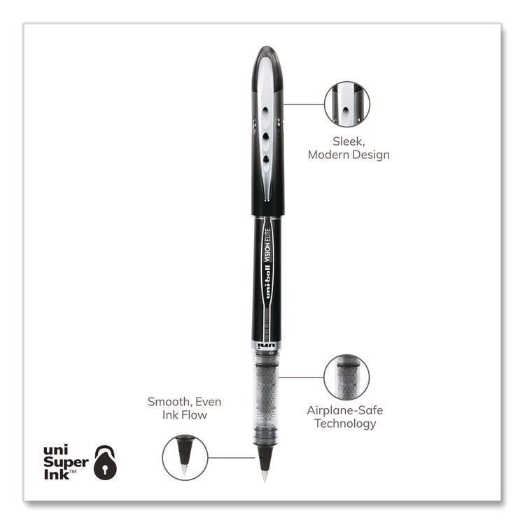 Create ideas as vividly as can be imagined with Vision Elite Rollerball Pens from uni-ball featuring a bend-resistant stainless steel tip and a tungsten carbide rollerball. Capped roller pens deliver smooth, intense lines with unparalleled definition - useful for note taking, list making, signing checks and legal documents, and even uniquely embellishing creative writing projects. Innovative uni Super Ink technology effectively entraps the gel ink into the paper, producing fraud, fade and water-resistant documents that resist check washing or bleaching. These Vision Elite pens have a special design that withstands cabin pressure variances without leaking, making them useful for travelers. Exclusive Uni-Flow Ink System ensures a consistent, delightfully fluid writing experience, and a translucent window ensures that you don't run out of ink unexpectedly. Express your signature style with the sleek, modern design and elite performance of uni-ball's Vision Elite Rollerball pen - no matter the altitude.