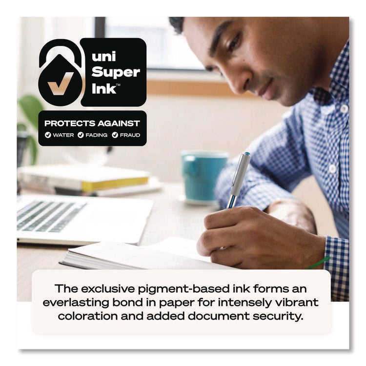- Fade-proof pens have uni Super Ink that makes them water and fraud-resistant.