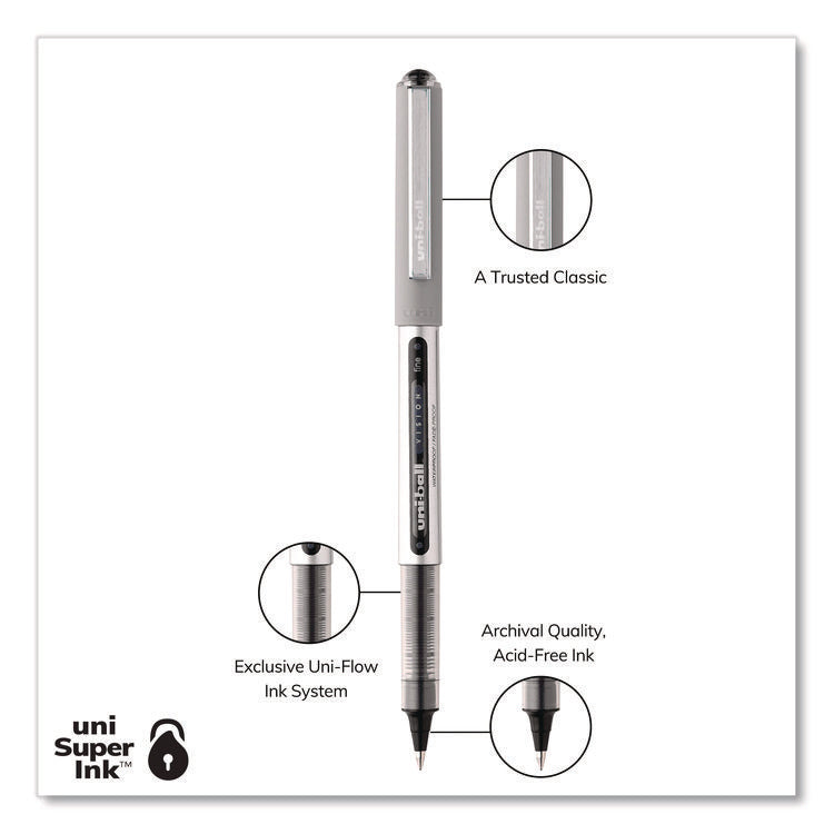 Make your everyday writing easy with the effortless and dependable performance of Vision Rollerball Pens from uni-ball featuring strong, long lasting tips. Capped roller pens deliver an even liquid ink lay-down for reliably smooth, vivid lines and a rich color for improved clarity and readability. Great for all writing tasks from taking notes to record keeping with archival quality, acid free roller ink. Innovative uni Super Ink technology forms an indestructible bond with the paper to minimize the risk of check washing or document fraud, while also protecting from water and fading. The exclusive Uni-Flow Ink System ensures a consistent, delightfully fluid writing experience, and a translucent window ensures that you don't run out of ink unexpectedly. Enjoy beautiful clean lines and give all of your ideas a burst of brilliant color with this classic style rollerball pen.