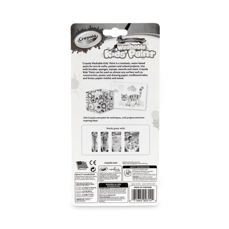 Get crafting with Crayola Washable Paint! Featuring vibrant, richly pigmented color, this craft paint is perfect for creating eye-catching artwork. Smooth, creamy colors are easy to blend and provide opaque coverage on a variety of surfaces. Use for large group projects, classroom crafts, at home creative activities and more! Colors can be used on their own or combined with other washable paints to create your own unique shade. Stray marks wash easily from skin and most washable clothing.