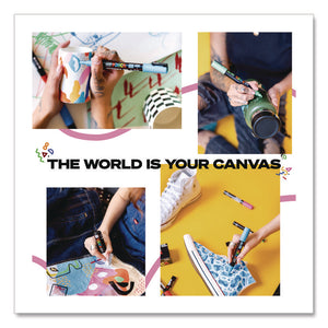 POSCA™ Water-Based Paint Markers can be used on almost any surface you can dream up: paper, glass, cardboard, wood, porcelain, metal, textiles, ceramics, plastics and so much more. Their felt tips are also versatile, allowing you to produce neat and precise lines when outlining and bold lines when filling in spaces. Water-based, alcohol- and solvent-free, opaque paint is blendable, covers surfaces well, dries quickly and can be layered once dry. Ideal for beginners and professionals alike, these markers are a fluid and fun choice for arts and crafts projects, retail window signage, automobile windshields as well as interior and exterior decor projects. As an added benefit, their tips can be rinsed with water to keep them intact, allowing you to blend without fear of ruining the color of any given marker. Non-toxic, light-fast and waterproof paint can be scraped off most nonporous surfaces, such as glass, while remaining permanent on porous surfaces, such as paper.