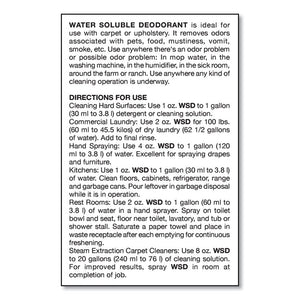 BIG D® Water-Soluble Deodorant is concentrated, easy to use and effective. Just a small amount added to water or other cleaning products will destroy odors on contact without changing the properties of the cleaner. BIG D® deodorants actually eliminate odors, not just mask them. And they are safe nontoxic, nonflammable and will not stain any material unaffected by plain water. WSD is versatile. Use it for mopping, shampooing, rinsing or in a hand sprayer or fogger. BIG D® Water-Soluble Deodorant is ideal for use with carpet or upholstery. It removes odors associated with pets, food, mustiness, vomit, smoke and more. Use anywhere there's an odor problem or possible odor problem: In mop water, in the washing machine, in the humidifier, in the sick room, around the farm or ranch. Use anywhere any kind of cleaning operation is underway.