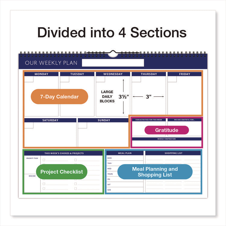 Keep your family organized and never miss an important event again. This undated Weekly Family Planner provides the flexibility you need to handle even the most hectic family scheduling and planning challenges. Each week's intuitive layout delivers open-format blocks for each day's appointments, events and activities, while providing handy formatted blocks and checklists for the week's chores, projects, priority tasks, rewards/incentives, meal plans, shopping lists and more. Flexibility doesn't end with its layout, either. Its unique design allows you to use it as a book, a wall-planner or a countertop pad.