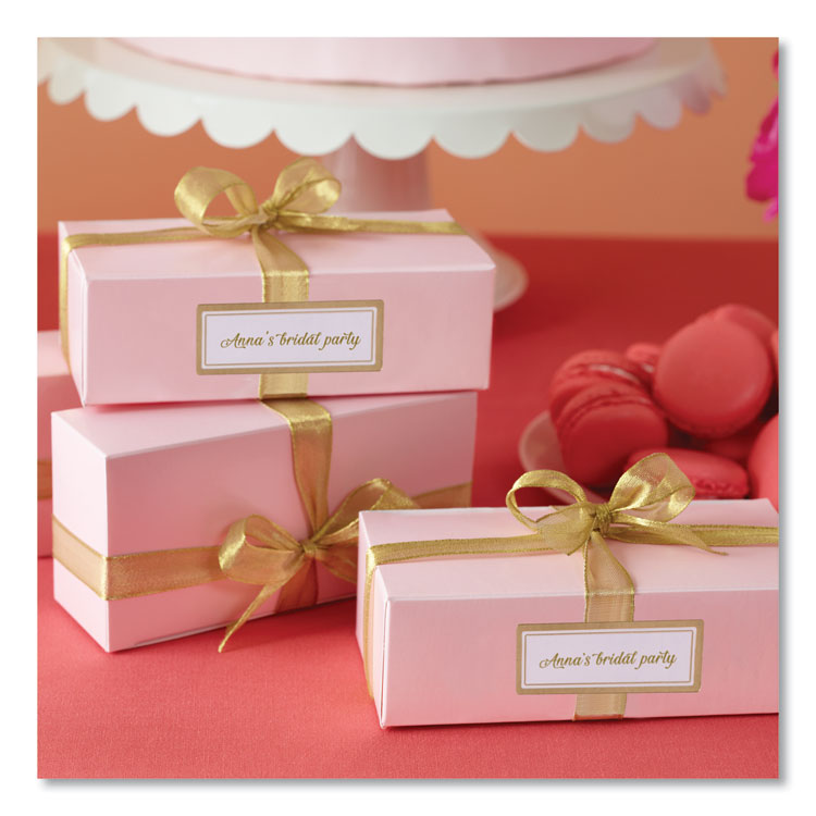 Remarkably reflective and elegant, Avery matte white rectangle labels with metallic gold borders bring a strikingly radiant shine to any event or project. Each rectangle label is pre-printed with a brilliant gold foil-like border that is guaranteed to capture people's attention. Avery Easy Peel technology makes it simple and easy to peel and place multiple labels quickly. Just bend back the label sheet to expose the pop up edges to peel away each label without risking ripping or tearing. Using a strong permanent adhesive, every label can stick and stay to a variety of surfaces including cardboard, envelopes, paper, glass, metal and more. Create beautiful designs and make your own address labels, wedding RSVP labels, party favor labels, product labels, food labels, holiday cards and more using the free design software and templates at avery.com/templates. Compatible with both laser and inkjet printers.