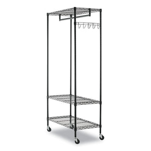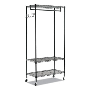 Time-saving design assembles in minutes without tools. Strong welded wire construction that allows air circulation and helps reduce dust buildup. Double-sided for quick access to items. Rack features hanging rod for garments, five support hooks for umbrellas, bags, and other items to accommodate your needs. Three shelves adjust in 1" increments and support 350 lbs. on each shelf. Four casters for quick mobility and two lock when it has reached your destination. Total unit capacity is 500 lbs. if used with casters. Hangers not included.