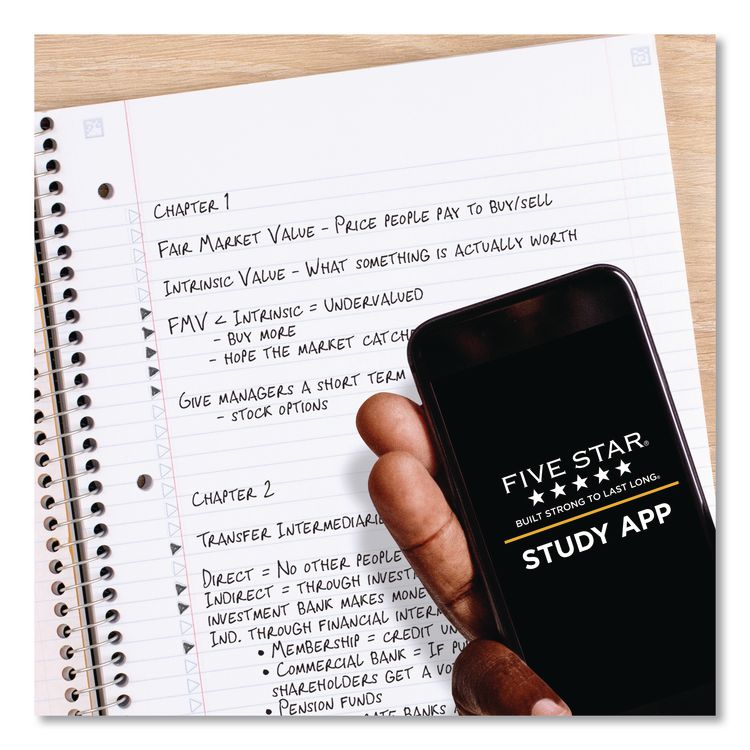Lasts all year. Guaranteed! Durable, water-resistant poly covers protect your notes all year. Reinforced, tear-resistant divider pockets keep your loose sheets together. Spiral Lock® wire binding prevents coil snag, and high-quality paper provides excellent ink-bleed resistance. Easily inserts into any three-ring binder (sold separately). Scan, study and organize your notes with the Five Star Study App. Create instant flashcards and sync your notes to Google Drive to access them anywhere from any device.