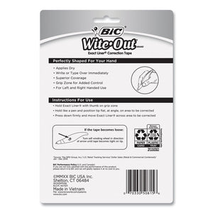 Make fast, easy, and precise corrections with BIC Wite-Out Brand Exact Liner Correction Tape. Tear-resistant film-based tape comes in a dispenser with a natural shape that fits your hand and a grip zone for comfort and control. The tear-resistant film-based tape requires no dry time and won't bleed or drip, so you can instantly write or type your corrections over it. For convenience, BIC Wite-Out Brand Exact Liner Correction Tape is suitable for left- or right-handed use and has a colorful, translucent body so you can see exactly how much tape remains. A self-winding wheel lets you easily rewind the tape should it become loose.