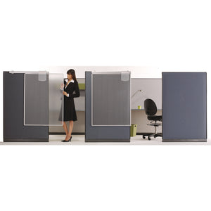 Highly durable, ultra-lightweight 36" x 48" partial-length sliding screen transforms cubicle workspaces into interruption-free work zones. Shatterproof, translucent polycarbonate screen slides open and closed, lets in natural light and allows you to see outside your cubicle. Versatile top-mounting system allows quick and easy installation on inside or outside of cubicle panels measuring 1Ľ" to 3Ľ" in thickness. Contemporary, translucent plastic panels and brushed aluminum frame complement any modular office environment. Leave notes for coworkers or post special information on whiteboard message board with built-in marker tray and nameplate. Fits cubicle walls between 50" and 70".