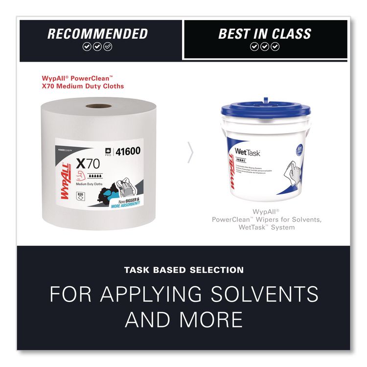WypAll® is the number one brand of disposable wipes in the US and Canada. Maximize performance while minimizing time, effort and product waste. If you've been using either laundered shop towels or textile shop rags, it's time to make the switch to WypAll® PowerClean™ X70 Cloths. The cloths are durable, absorbent industrial cloths featuring high-tech Hydroknit® material. WypAll® X70 cloths now absorb up to 20% more oil and water than before. In addition, Theys now feature a new cloth-like look and feel for enhanced absorbency, making them even more effective for your cleaning tasks. These medium duty cloths are made of soft pulp fibers, bonded to a polypropylene base sheet for absorbency and tear resistance, making them suitable for removing dirt, oil, grime and solvents in a variety of industrial and manufacturing industries. WypAll® X70 cloths are so sturdy that they can often be used more than once. (Once you've used them a few times, they're disposable.) These premium industrial cleaning cloths are designed to clean surfaces and tools, making them a must-have for the HVAC, automotive, manufacturing and industrial industries. When you're running a business, it pays to use the very best supplies. Trust the performance and innovation of WypAll® PowerClean™ X70 Medium Duty Cloths today.