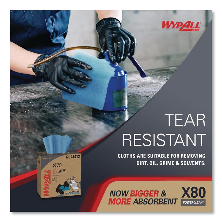 WypAll® is the number one brand of disposable wipes in the US and Canada. Maximize performance while minimizing time, effort and product waste. If you've been using either laundered shop towels or textile shop rags, it's time to make the switch to WypAll® PowerClean™ X70 Cloths. The cloths are durable, absorbent industrial cloths featuring high-tech Hydroknit® material. WypAll® X70 cloths now absorb up to 20% more oil and water than before. In addition, Theys now feature a new cloth-like look and feel for enhanced absorbency, making them even more effective for your cleaning tasks. These medium duty cloths are made of soft pulp fibers, bonded to a polypropylene base sheet for absorbency and tear resistance, making them suitable for removing dirt, oil, grime and solvents in a variety of industrial and manufacturing industries. WypAll® X70 cloths are so sturdy that they can often be used more than once. (Once you've used them a few times, they're disposable.) These premium industrial cleaning cloths are designed to clean surfaces and tools, making them a must-have for the HVAC, automotive, manufacturing and industrial industries. When you're running a business, it pays to use the very best supplies. Trust the performance and innovation of WypAll® PowerClean™ X70 Medium Duty Cloths today.